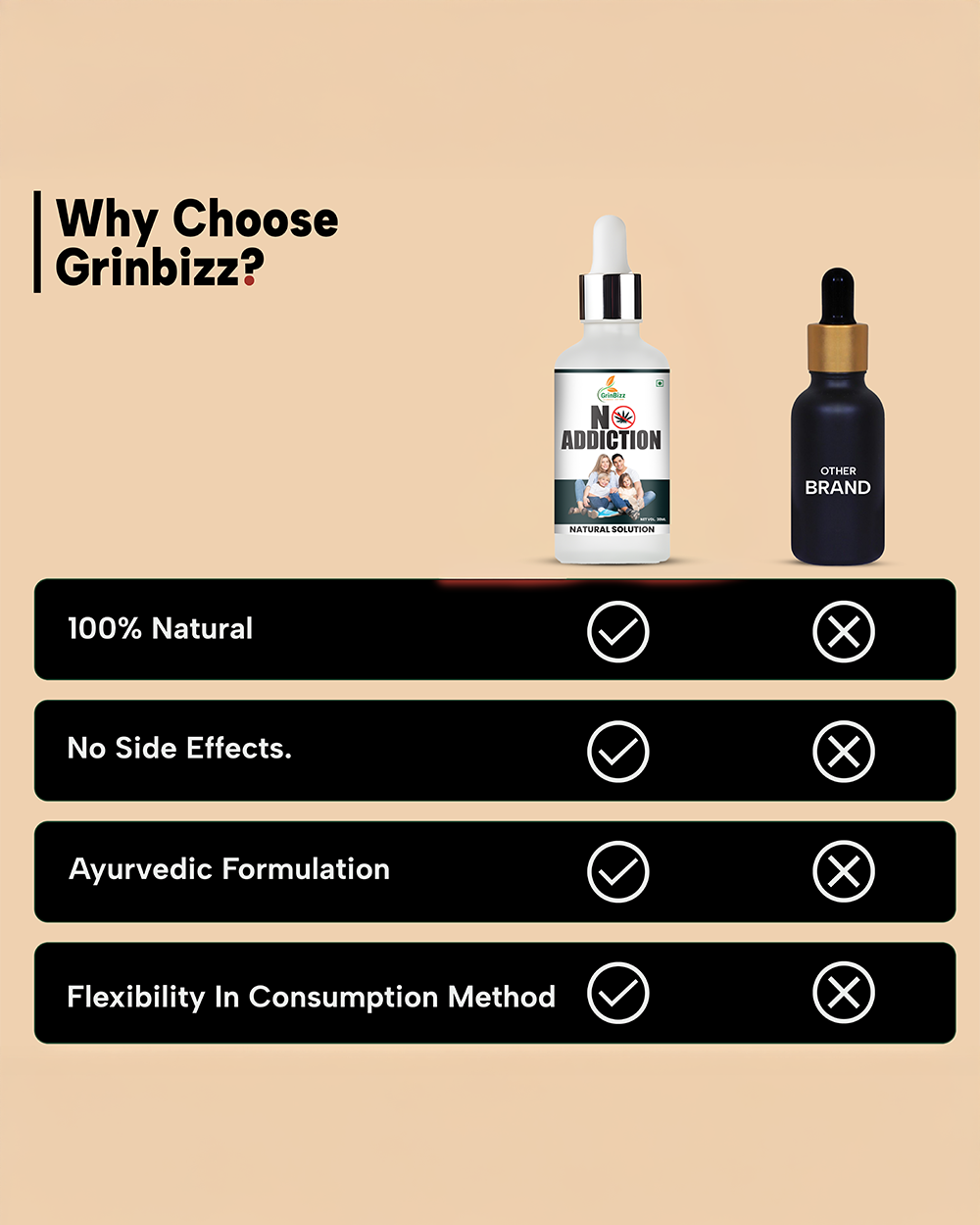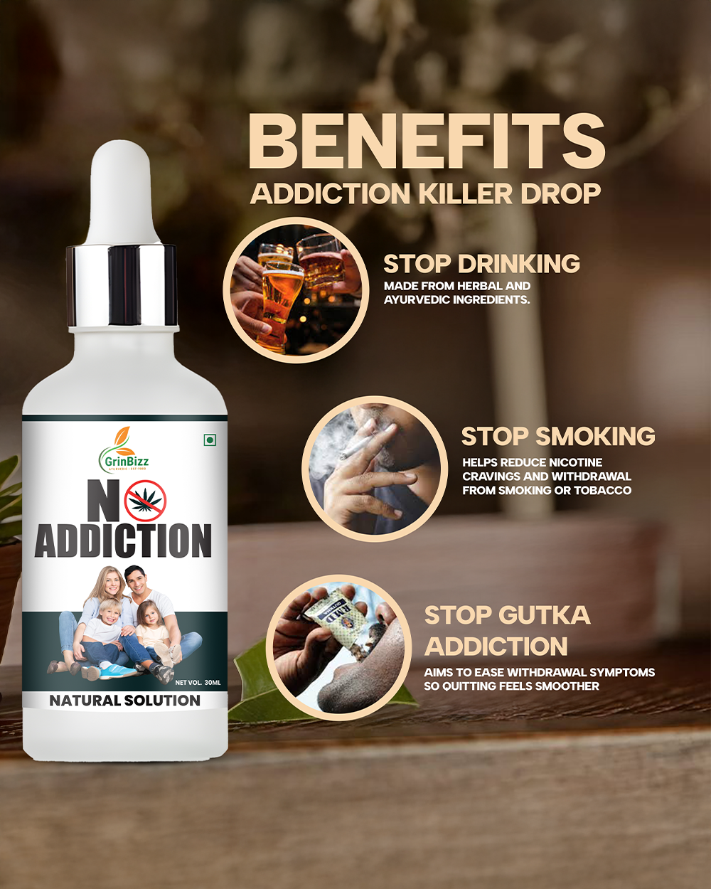 No Addiction Drop is a natural herbal formulation designed to help reduce dependency on harmful substances such as alcohol, cigarettes, and tobacco. Made with powerful Ayurvedic detoxifying and calming herbs, it helps purify the body, reduce cravings, and support emotional balance. This gentle formula also promotes mental clarity, improves willpower, and supports overall wellness during the recovery process.