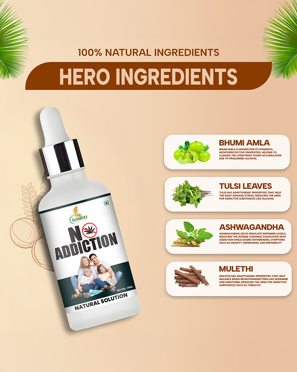 Ashwagandha, Brahmi, Tulsi, Giloy, Kudzu Extract, Shankhpushpi, and other detoxifying and anti-craving herbal extracts.